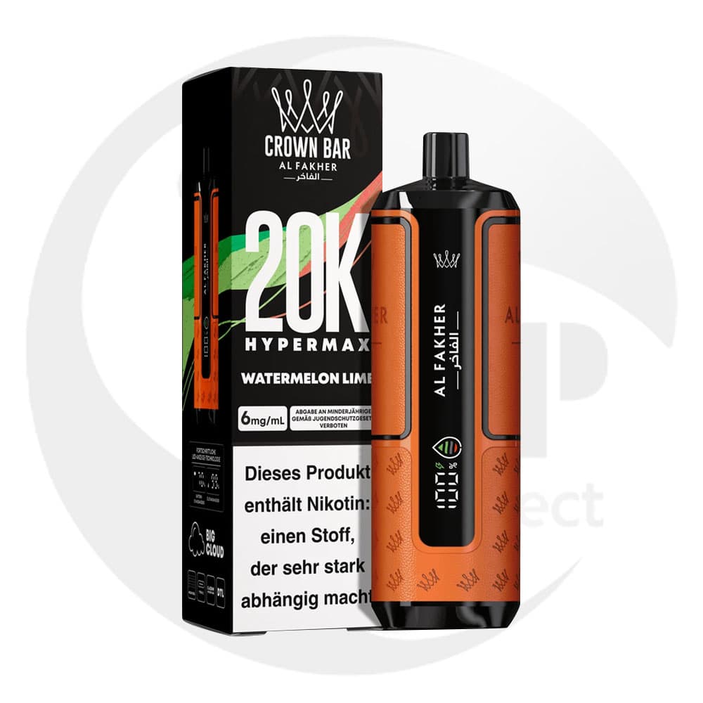 Al Fakher 20K Hypermax Bundle liefert intensiven Frucht- und Frische-Genuss mit bis zu 20.000 Zügen im kompakten Design. 800 mAh Akku, 22 ml Liquid, 6 mg/ml, DTL-Mesh-Coil, USB-C, LED-Display, Auto-Draw, stufenloser Airflow, Kindersicherung, geschlossenes System.