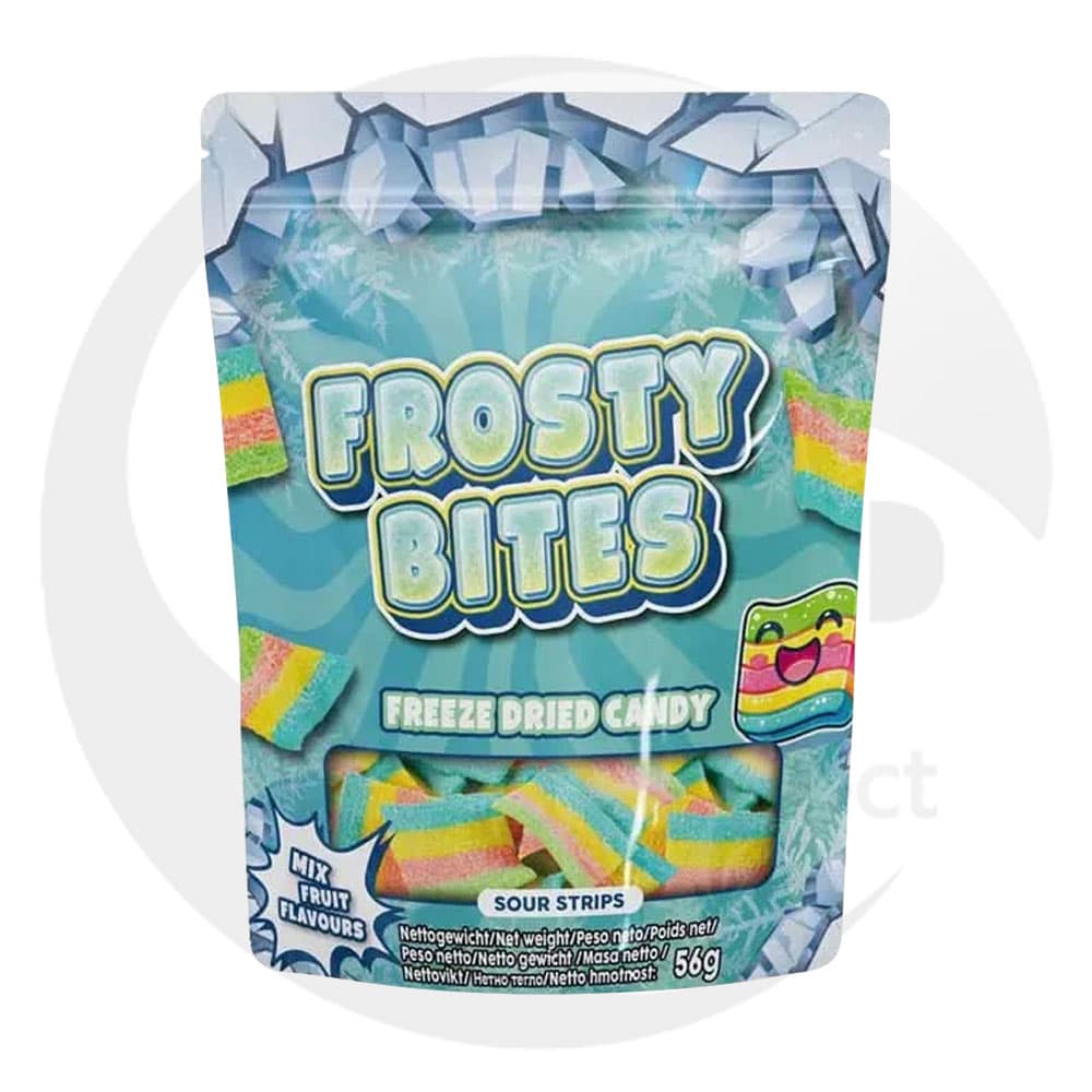 Frosty Bites pop: 50g gefriergetrocknete Gummis mit intensiv süß-fruchtigem Aroma und kühlem Frische-Kick. Knusprig-luftige Textur, 0g Fett, 388 kcal/100g (77,6g Zucker), natürliche Fruchtaromen, Farbstoffe E102/E110, ohne Nikotin/Cannabinoide. Ideal für unterwegs und aromatische Genussmomente.